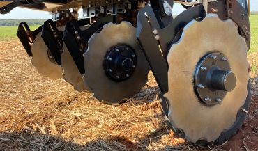 Sua combinação de discos recortado e liso gera uma capacidade superior para corte de palha, pois o disco recortado trabalha puxando a palha abaixo do conjunto ao invés de empurrar a mesma. Aliado a isso sua roda limitadora de profundidade segura a palha enquanto está sendo cortada evitando o envelopamento do adubo no solo. Na maioria das texturas de solo o próprio disco recortado deposita terra sobre o adubo evitando o contato com o ar.